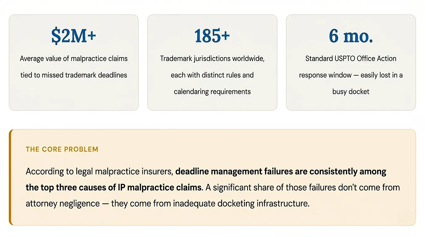 The rise of global trademark portfolios, multi-class filings, Madrid System registrations, and USPTO digitization has exponentially increased the complexity of trademark docketing. What was manageable in a 50-mark portfolio with one jurisdiction is operationally dangerous in a 500-mark portfolio spanning 20+ countries – especially without a professional whose entire role is built around protecting that docket.